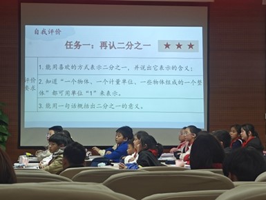 林老師對學(xué)生的評價也非常值得學(xué)習(xí),給我印象很深的一句話“老師非常欣賞能自己完善自己想法的人”,盡管一開始那個學(xué)生回答磕磕巴巴,但在老師的鼓勵下,第二次就流利且完整的將問題回答得很完美。林莉老師將這節(jié)課分為三個環(huán)節(jié)“再認二分之一”,“再認幾分之幾”“再認幾分之一”,每一個環(huán)節(jié)都有一個評價表格,學(xué)生對這一個環(huán)節(jié)的學(xué)習(xí)情況自評打星星,這是一個非常有意思的環(huán)節(jié),不僅總結(jié)這一環(huán)節(jié)的學(xué)習(xí)重點,也提高學(xué)生學(xué)習(xí)參與度,重視學(xué)生的及時反饋。