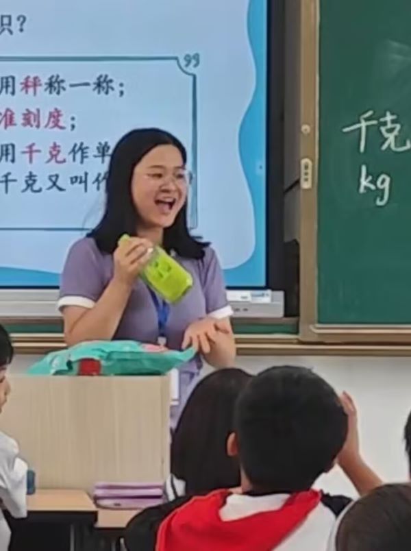 2023年9月27日,我開始了在大浦中心小學(xué)三 (5)班第一次新授課:《認(rèn)識(shí)千克》。因?yàn)樘崆昂椭笇?dǎo)老師打聽過(guò)學(xué)校沒(méi)有盤秤,所以課本上稱書包,稱數(shù)學(xué)書這樣的環(huán)節(jié)難以進(jìn)行。課前我準(zhǔn)備了1千克紅棗,1青梅綠茶,一袋1千克大米以及一袋薯片,我還將宿舍的電子體重計(jì)帶入課堂,盡可能的讓同學(xué)們能對(duì)千克有更直觀的理解。