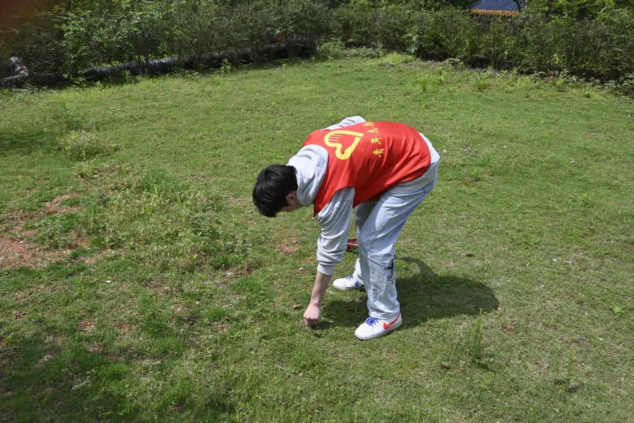 圖為志愿者撿拾草地的落葉和碎屑,認真清潔著草地上的每一個角落。