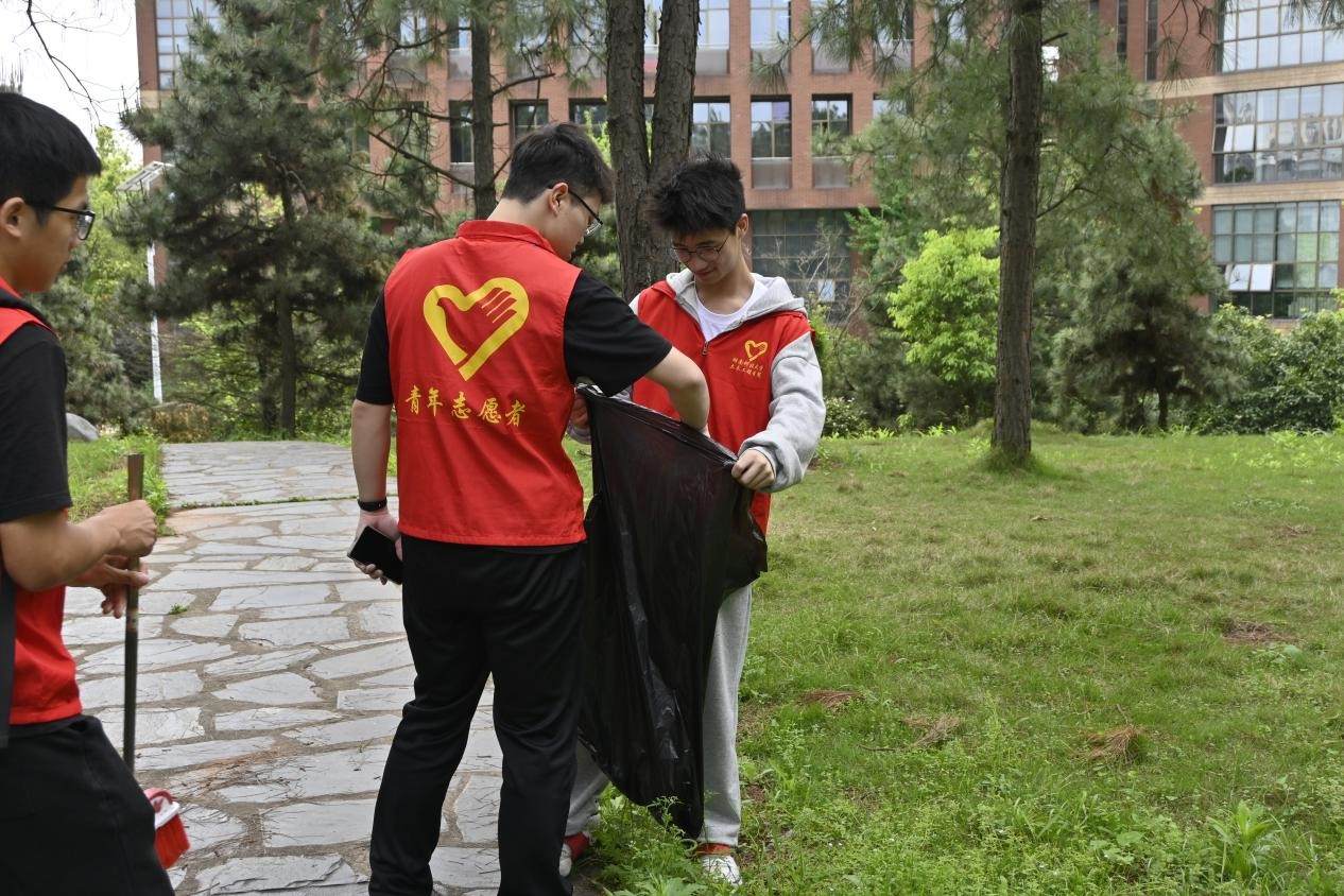 圖為志愿者收集著清潔來的垃圾,將其全部帶走讓松園一塵不染。