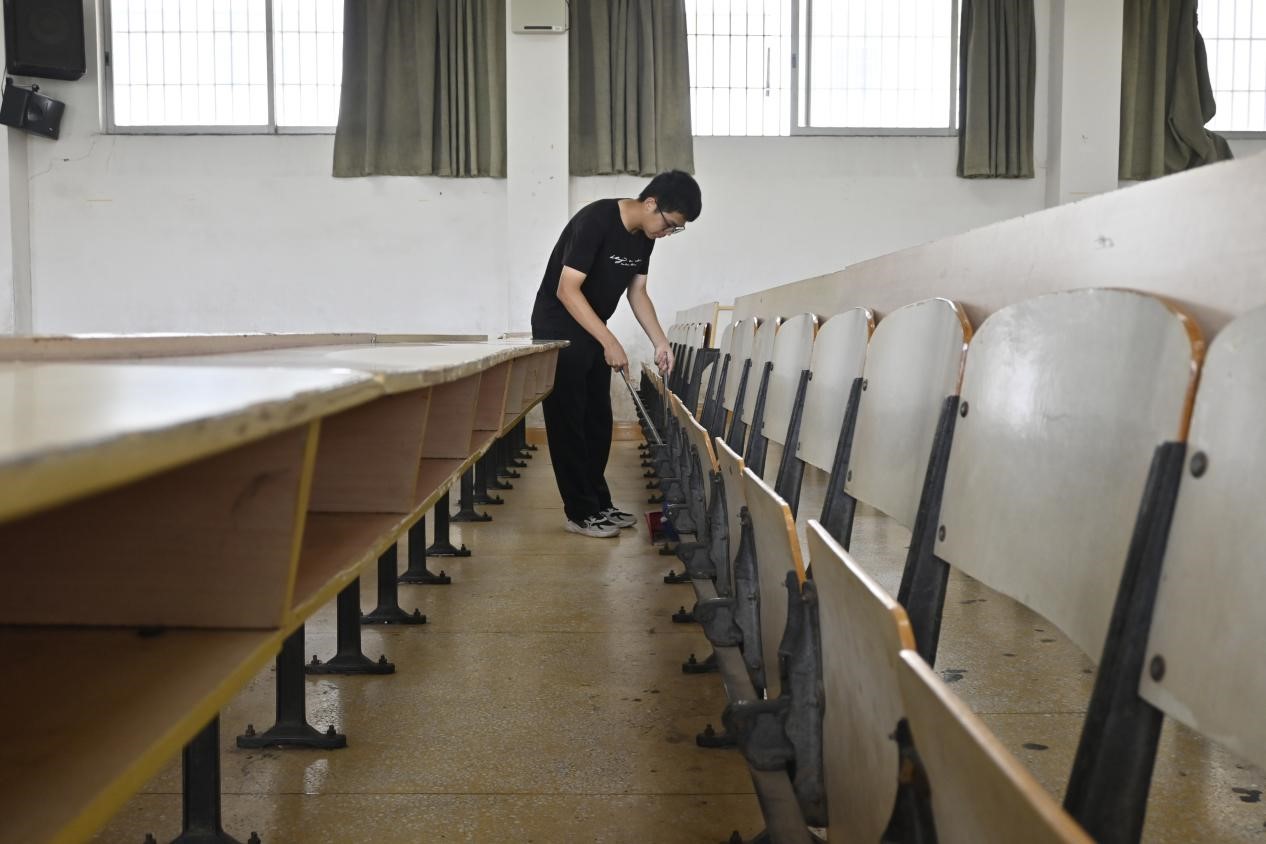 圖為志愿者打掃第五教學樓教室衛生,確保教室整潔的環境。