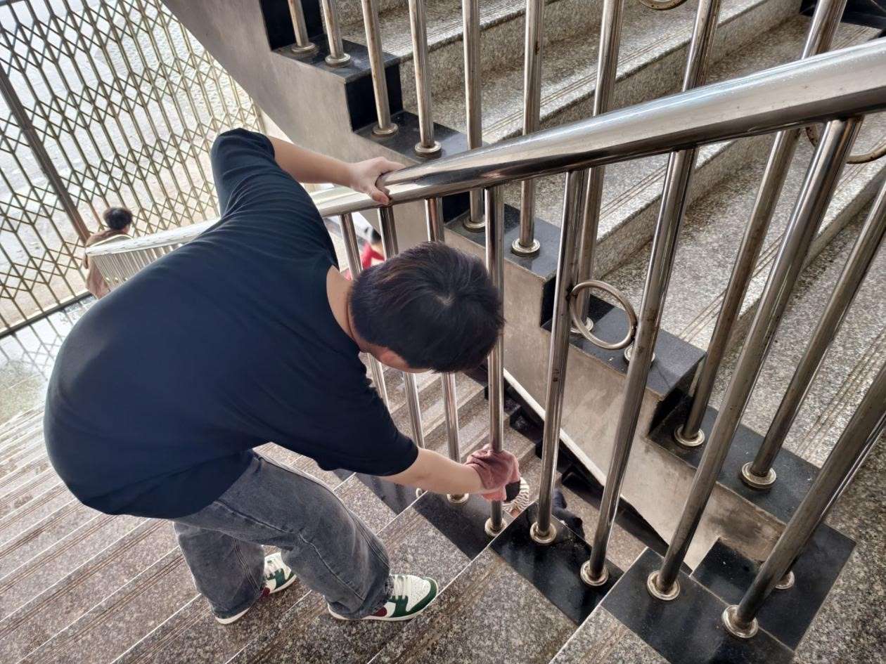 圖為志愿者打掃土木樓衛生,清潔樓梯扶手。