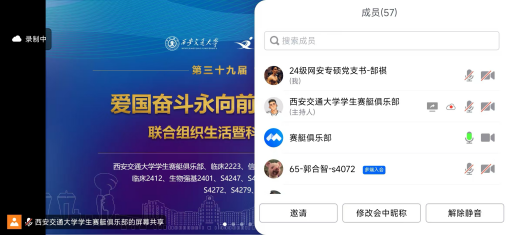 會議在興慶校區主樓A203教室舉行,創新港同學在騰訊會議中觀看。會議由西安交通大學學生賽艇俱樂部團支書王皓田主持會議,來自浙江大學、天津大學、同濟大學、上海立信會計金融學院等多所高校的學生代表參與會議。