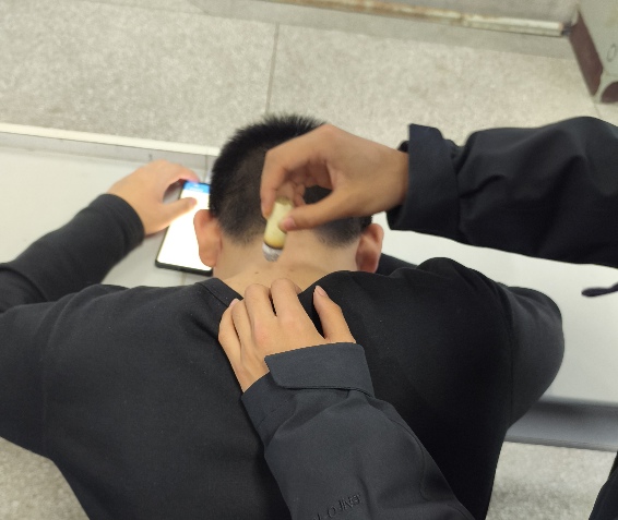 活動后半程,學員被分發艾條,親身體驗艾灸操作,從點燃艾條到手法施灸。隨著縷縷艾煙升起,實訓室內彌漫著清苦的艾香,學員們凝神屏息,在社團培訓教學員指導下嘗試將艾條懸于穴位上方2-3厘米處,通過手腕的微妙調控感受火候把控部門。社團培訓教學員俯身指導,在現場巡回教學,親身感受會員的動作是否準確,糾正動作細節要點。
