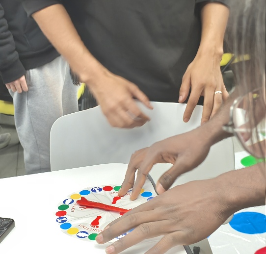 游戲互動(dòng),轉(zhuǎn)盤踩色趣味橫生。隨著活動(dòng)進(jìn)入高潮,中外學(xué)生組隊(duì)參與特色互動(dòng)游戲。參與者需轉(zhuǎn)動(dòng)彩色轉(zhuǎn)盤,根據(jù)指針停留顏色,用左右腳交替踩踏對(duì)應(yīng)色塊的地墊。游戲中,學(xué)生因緊張“同手同腳”引發(fā)爆笑,搭檔的學(xué)生立刻提示“Left foot! Blue!”,最終兩人默契通關(guān)。游戲設(shè)計(jì)巧妙,既練反應(yīng)力,又促使學(xué)生用英語(yǔ)溝通。