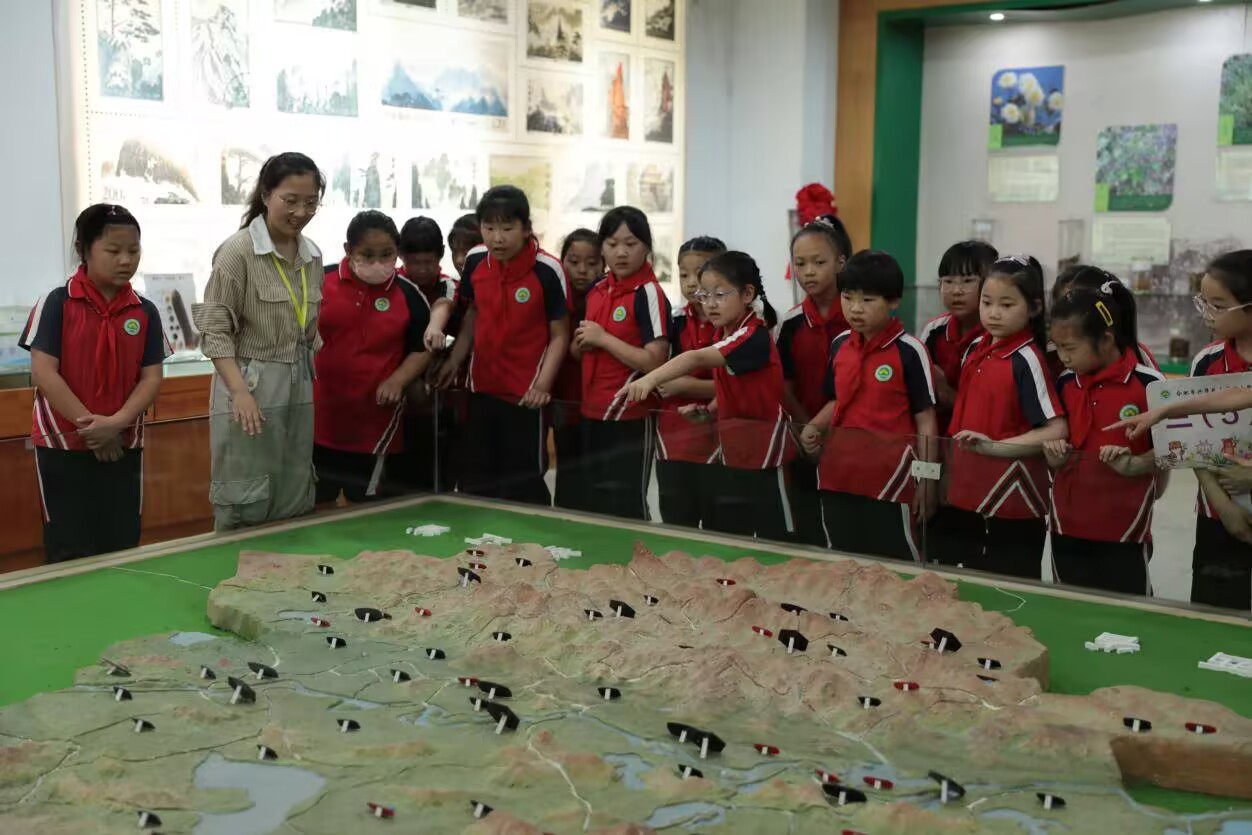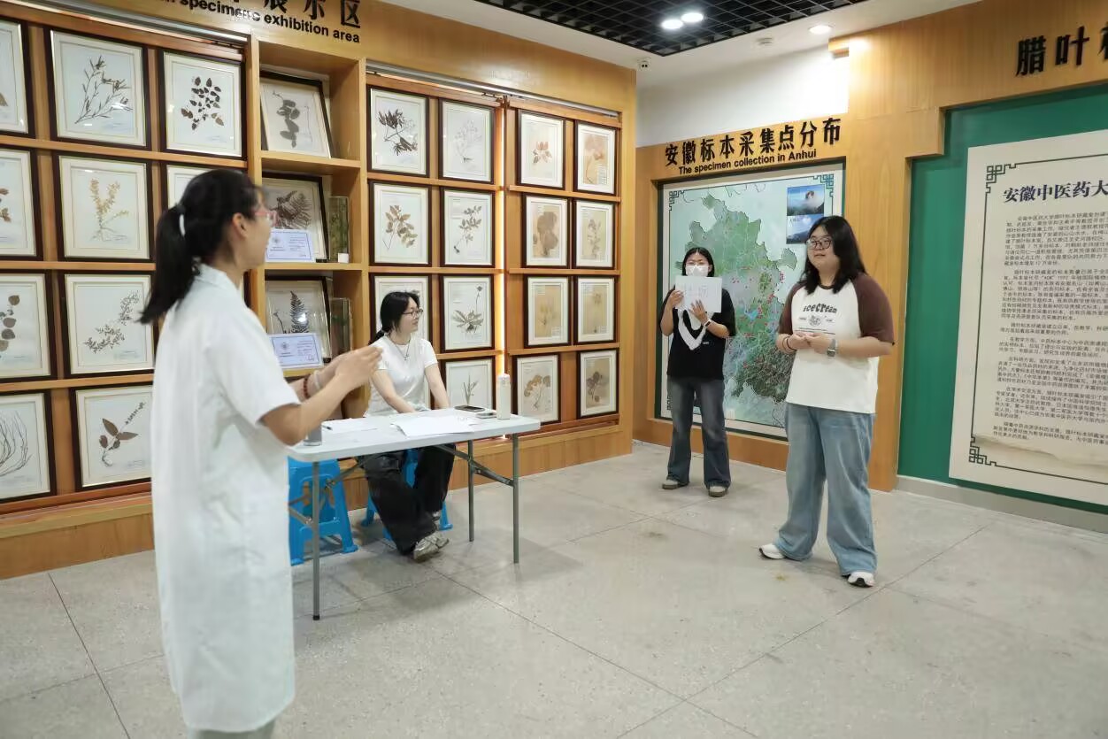 中藥性狀識別館的講解人員為孩子們講解藥物分布(聶欣悅攝)