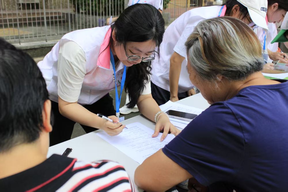 (圖為筑愛(ài)支隊(duì)隊(duì)員在給居民進(jìn)行問(wèn)卷調(diào)查/鐘栩祈攝)