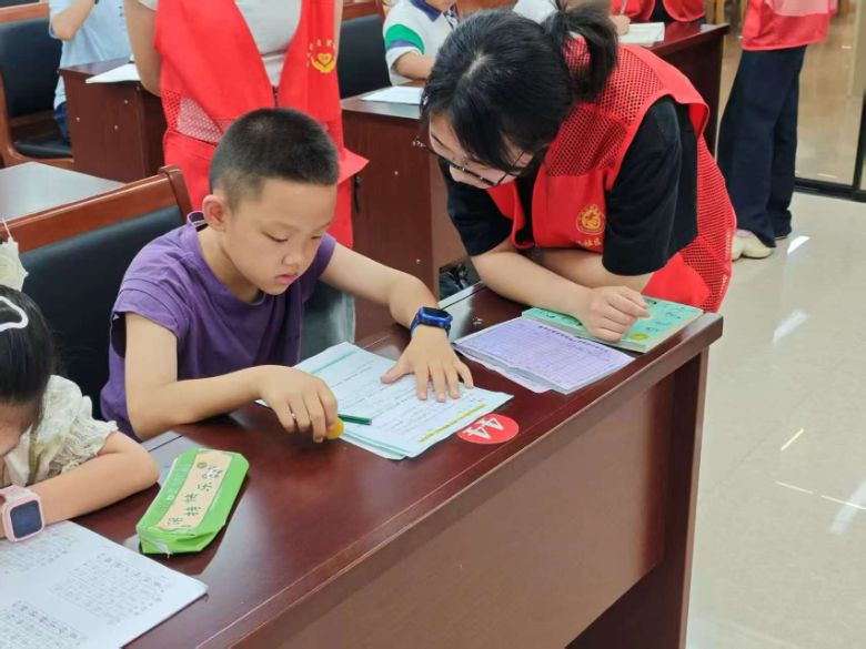 實踐隊以“課業(yè)輔導(dǎo) + 多彩課堂”模式,為低齡學(xué)生打造暑期學(xué)習(xí)樂園。課業(yè)輔導(dǎo)中,隊員化身“小老師”,針對不同年級、學(xué)科的知識難點,開展“一對一”或“小組式”輔導(dǎo)。摒棄填鴨式教學(xué),用啟發(fā)式引導(dǎo)讓知識鮮活:把古詩詞編成故事,將數(shù)學(xué)難題轉(zhuǎn)化為生活實例。原本頭疼寫作的初一學(xué)生,都興奮感慨“寫作文像講故事一樣好玩” ,孩子們緊鎖的眉頭舒展,求知欲被點燃。