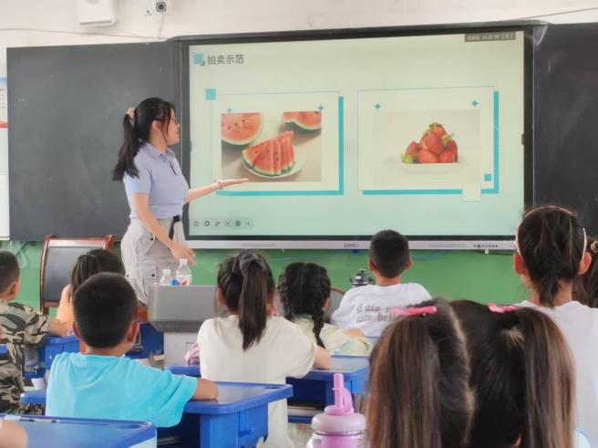 緊接著,課堂迎來了“實物詞匯拍賣會”環節!隊員們展示了一系列生動的生活圖片,如“甜甜的西瓜”“毛茸茸的小狗”“閃閃的星星”,鼓勵孩子們用形容詞競拍。小朋友們爭先恐后地舉手:“我要‘香噴噴的面包’!”“我覺得彩虹是‘五彩斑斕’的!”課堂氣氛活躍,孩子們在游戲過程中積累了豐富的詞匯。他們不僅掌握了新詞,而且在互動中提高了語言運用能力。