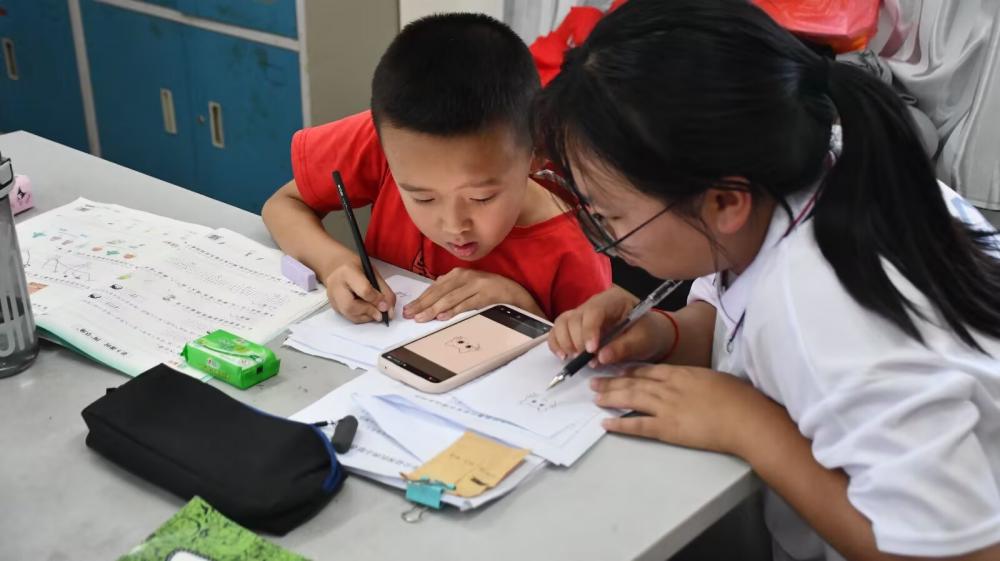 圖為實踐團成員與小朋友共同創作小貓簡筆畫。楊謝超攝
