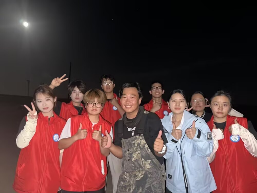 火光映照下,交流的話語格外真摯。曹雨老師傾聽著隊員們跨越3000里來到民勤的故事,肯定了這份在風沙中堅守的決心——從灌溉第一株梭梭到直播推廣蜜瓜,從撿拾基地垃圾到宣傳軟塑環保理念,每一份行動都是對“美麗中國”最生動的注解。他寄語隊員們,生態保護的道路或許漫長,但青春的熱忱與堅持,終將讓沙粒聚成綠洲,讓星火點亮希望,鼓勵大家在這條路上步履不停,讓更多人看見治沙人的堅守。