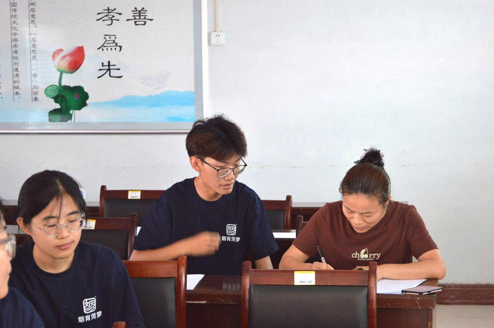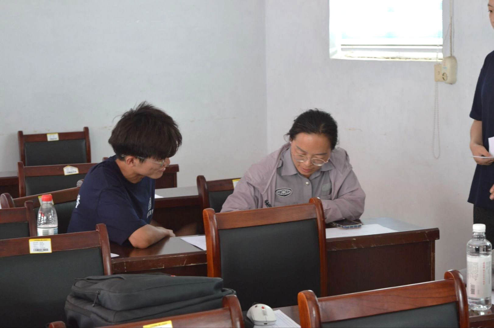 家長們圍坐在長桌旁,手里握著筆,低頭認真填寫著。有的家長戴著老花鏡,瞇著眼一筆一劃地填寫著表格上的各項信息,偶爾停下筆,輕聲向旁邊的隊員確認填寫細節,隊員立刻彎下腰,指著表格上的對應位置耐心說明,讓家長慢慢填寫,不急不躁。