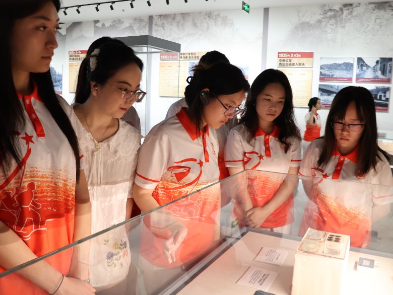 邁入展廳,動態沙盤上紅藍箭頭交錯穿梭,生動再現“四渡”奇謀。“一渡赤水,紅軍佯攻貴陽卻西渡避鋒,如游龍入川南,跳出重圍;二渡赤水,趁敵不備回師東進,婁山關大捷驚破敵膽,正是‘聲東擊西’的妙筆。”講解員指向沙盤上的轉折點,“三渡赤水,紅軍再入川南,佯裝北渡長江,引得敵軍主力云集;待敵布防剛定,四渡赤水隨即上演,紅軍趁夜南渡烏江,直逼貴陽,蔣介石急調滇軍馳援,紅軍卻借此從容入滇——這般‘出奇制勝’,堪稱用兵如神。”隊員們油然而生敬佩之情,不禁感嘆“戰爭指揮的最高藝術就是指揮敵人,四渡赤水確為毛主席的得意之筆!”昔日紅軍以創新智慧沖破常規戰術枷鎖;當代青年更應破定式以開新域,礪堅心而鑄鴻章。