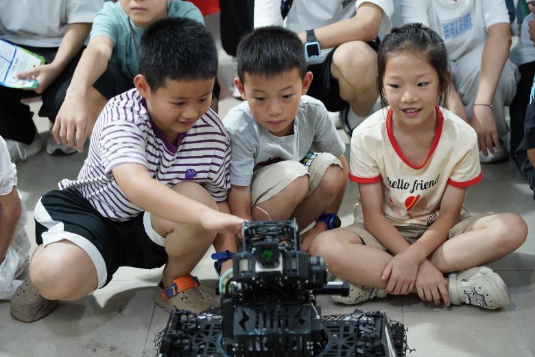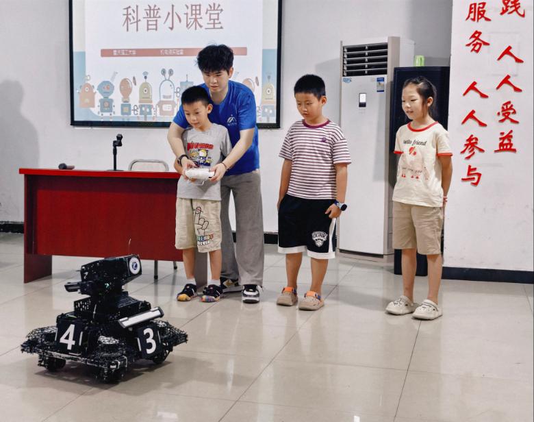 實踐團成員不僅詳細講解了機器人的設計原理、技術亮點及其在國防、科研等領域的應用前景,更將科技的魅力化為可觸可感的互動體驗。小朋友們圍在機器人周圍,在大學生哥哥姐姐手把手的指導下,親自操縱機器人完成移動、旋轉、發射等動作。當機器人靈活地執行著指令,孩子們臉上綻放出驚喜與自豪的笑容,指尖操控的不僅是一臺機器,更是對科技奧秘的好奇與對創新未來的無限憧憬。