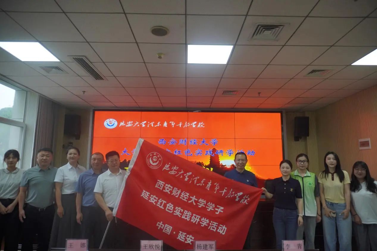延安大學黨委副書記楊偉宏在致辭中指出,延安大學始終堅守 “用延安精神辦學育人” 的初心,將紅色資源轉化為育人資源,形成了 “課堂教學 + 實踐體驗 + 網絡浸潤” 的立體化教育模式。他希望西安財經大學學子通過此次研學,深刻理解延安精神的 “根” 與 “魂”,在未來學習生活中做到 “學有所思、學有所悟、學有所得”,并向先鋒班授旗,寄語青年學子 “以旗幟為指引,讓延安精神在新時代綻放光芒”。實踐隊隊長張雨瀟同學代表接旗。
