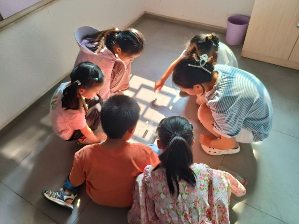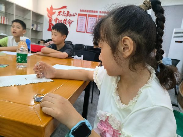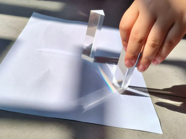 在實踐環(huán)節(jié),范美艷為小朋友們分發(fā)了三棱鏡、白卡紙等材料,幫助小朋友們調(diào)整棱鏡角度、尋找最佳光源。范美艷講解了光源與三棱鏡的放置方法。她說道:“將三棱鏡固定在陽光下或白光光源照射處,使光線從三棱鏡的一個折射面入射,再調(diào)整三棱鏡的角度,讓入射光線與棱鏡的折射面形成合適夾角,確保光線能經(jīng)兩個折射面發(fā)生兩次折射,最后在三棱鏡的另一側(cè)放置白卡紙,移動卡紙距離,直至上面清晰呈現(xiàn)紅、橙、黃、綠、藍(lán)、靛、紫的連續(xù)光譜。”