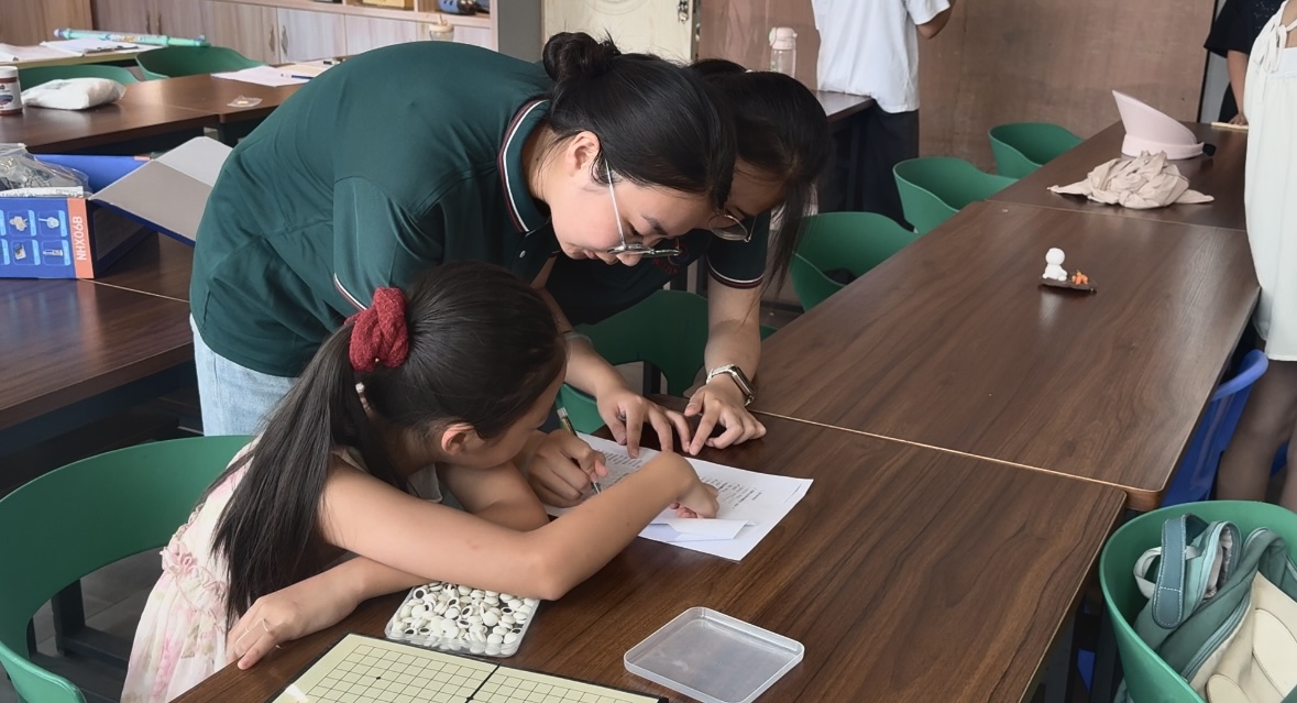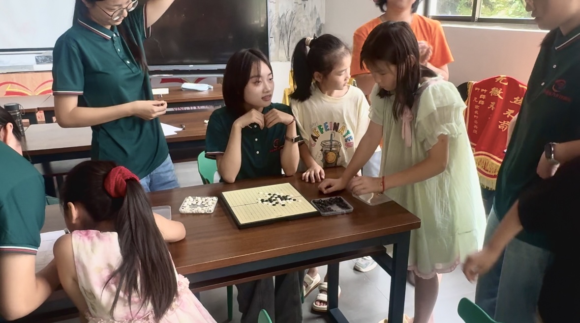 上午10:00,實踐團成員從圍棋的起源、基本規則到簡單的戰術技巧,用通俗易懂的方式講解。在實踐環節,大家兩兩對弈,認真思考、謹慎落子,實踐團成員則在一旁悉心指導,適時給予鼓勵和建議。小小的棋盤上,不僅展現著孩子們對新知識的渴望和探索精神,更讓他們在對弈中體會中華文化的博大精深,培養耐心、專注力和思維能力。