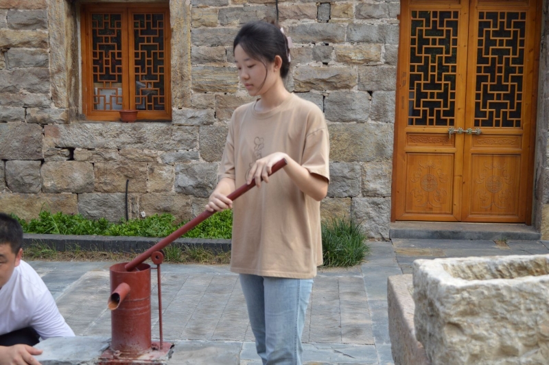 而劉舒涵則對壓水器產生了濃厚的興趣。她俯身操作,感受著古老工具的神奇力量。隨著手柄的起落,清涼的水流潺潺而出,這看似簡單的過程,卻讓她感受到了傳統勞作方式的智慧與魅力,也讓她對這片土地上的生活有了更深刻的理解。