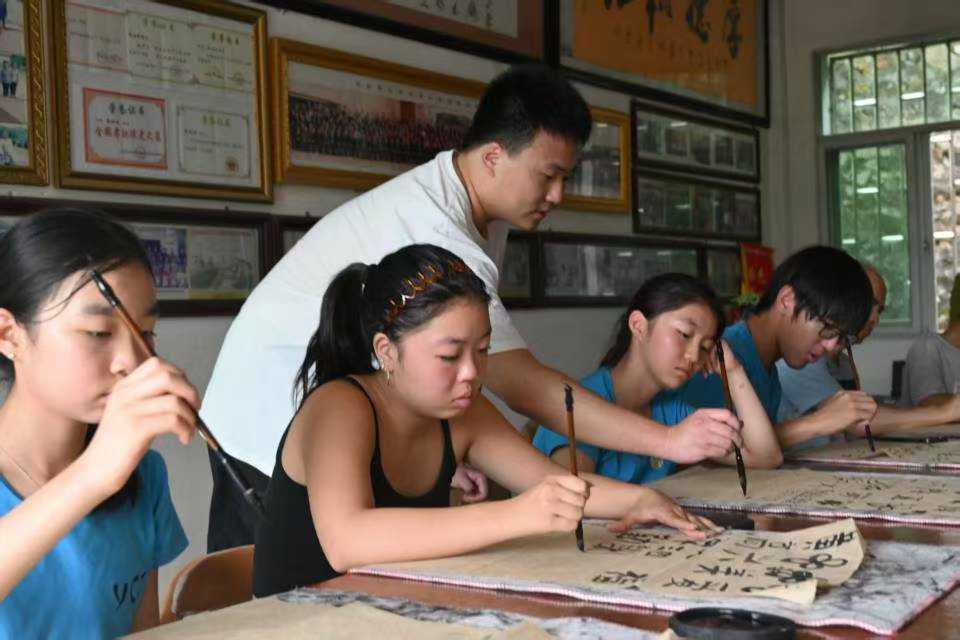 我們今日為同行的美國支教團安排了獨特的一課。徐興遠老師教美國孩子學習了軟筆書法。他先示范握筆姿勢,再介紹隸書行筆的原理。“寫‘橫’要先頓筆,再勻速移動。”他逐個糾正姿勢,握住孩子的手帶他們感受運筆力度。練習幾遍后,孩子們筆下的筆畫逐漸平穩,雖然仍顯稚嫩,卻多了幾分規整。有人舉著自己的作品笑,眼里滿是成就感。