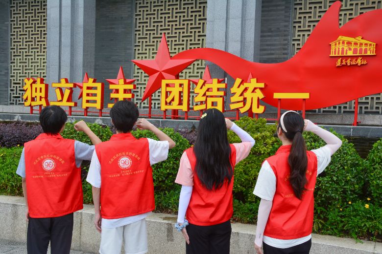 圖為筑夢團成員面向會址致敬歷史 張丹攝