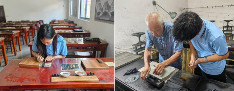 探徽墨文化之今,習徽墨墨廠之華。11日上午,實踐團隊在老胡開文墨廠深入學習制墨,以及其核心步驟:煉煙、和膠、搗杵、成型、晾墨、描金六大工序。工序的過程對環境和制墨人技術都有很高的要求,一次完整的制墨過程長達數月甚至數年。進入墨廠,徽墨的陣陣幽香讓人感到寧靜舒適,在這里我們見到了徽墨的非遺繼承人胡嘉明老先生。他向我們仔細講解制墨過程,面對同學們對制墨細節的提問,老先生都耐心仔細地向我們解答。同學們也親身參與了其中兩個環節。首先將墨膏固,填入石楠木雕版,壓緊后以“木膘”(硬木楔)敲擊加固。同時,了解了壓模三訣:“力均則形正,速緩則紋清,溫潤則脫模利”。接著同學們還體驗了描金的環節,用礦物顏料(金粉、朱砂、石青)描繪紋飾,為墨條增加色彩,成為墨條的點睛之筆。