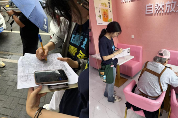 下午,實(shí)踐隊(duì)開(kāi)始分組走訪東西大街的各個(gè)商鋪,以詢問(wèn)為主,聊天為輔的方式,對(duì)當(dāng)?shù)鼐用窈蜕特溸M(jìn)行問(wèn)卷調(diào)查。在與當(dāng)?shù)鼐用窠涣鞯倪^(guò)程中,實(shí)踐隊(duì)的隊(duì)員們更加直觀地了解了崧廈街道居民的實(shí)際生活情況及需求,在發(fā)現(xiàn)居民對(duì)美好生活環(huán)境的向往和老舊城鎮(zhèn)環(huán)境落后的矛盾問(wèn)題的同時(shí),對(duì)城鎮(zhèn)更新的項(xiàng)目需求有了更深的理解。