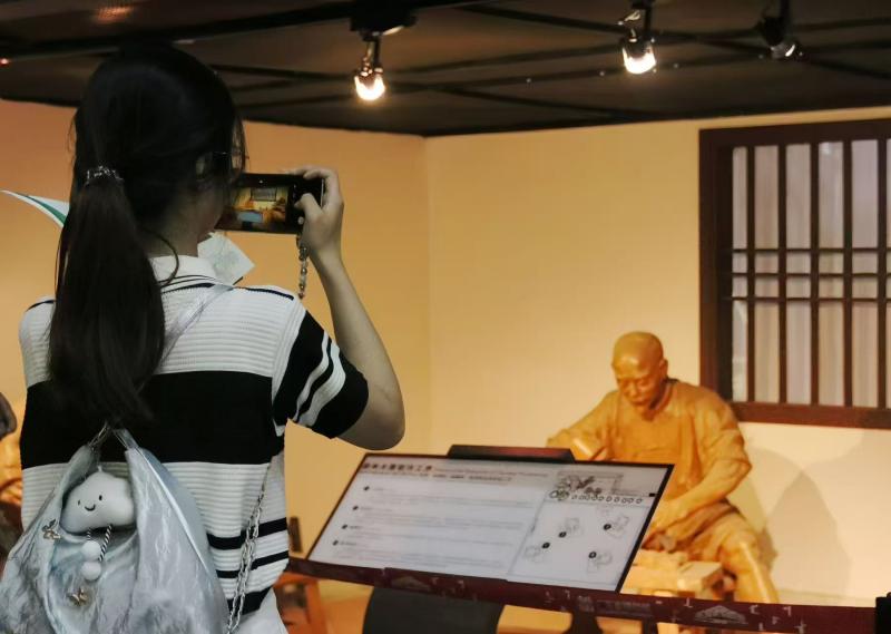 潮州木雕作為我國(guó)著名的民間傳統(tǒng)木雕流派之一,歷史悠久且具有鮮明的地方特色,隊(duì)員們?cè)诔敝菽镜裾箯d里充分感受到了潮州木雕工藝的精湛。該展廳主要分為源流篇和器用篇。源流篇主要介紹了潮州木雕的發(fā)展歷程,潮州木雕的發(fā)展興衰生動(dòng)地折射著潮汕地區(qū)歷史和文化的變遷。器用篇主要展示了潮州木雕在建筑裝飾、禮祭器具、家具陳設(shè)等方面的應(yīng)用,其中,精美的壽屏、木雕擺件、木雕撰盒等木雕藝術(shù)讓成員們嘆為觀止。