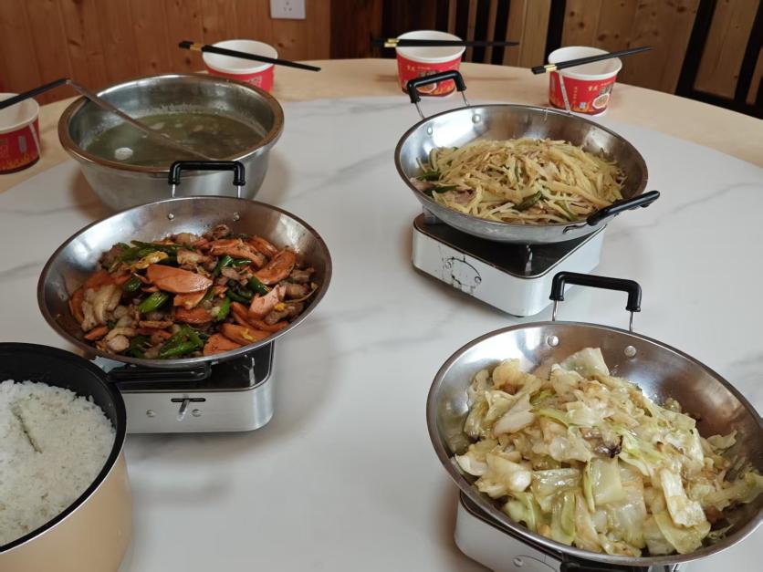午餐時分,四道菜陸續上桌:炒包菜色澤翠綠,保留著蔬菜的本味;農家一碗香以雞蛋、辣椒和肉末同炒,鮮辣開胃,成為下飯“主力”;絲瓜蛋湯湯色清亮,蛋花均勻浮在湯面,絲瓜的清甜與蛋香融合得恰到好處;炒土豆絲金黃油亮,帶著柴火灶特有的焦香。隊員們輪流盛飯,有人主動為隊友添湯,有人分享著各自崗位的趣事,小院里笑語不斷。