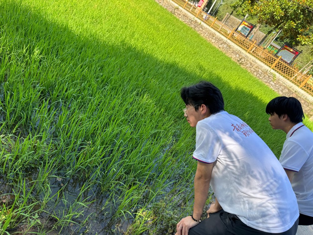 午后烈陽高懸,實踐團轉向村外田疇。連片稻田泛起綠波,蔬菜大棚錯落有致,一幅現代農業畫卷鋪展眼前。在村農技員張師傅帶領下,成員們蹲在田埂觀察水稻長勢:“這片田用生態肥,病蟲害少,產出的‘紅色田園’稻米,游客搶著買!” 順著指引,遠處紅色旅游步道與農田相映成趣 —— 原來,中分村正探索 “紅色文化 + 生態農業”融合模式:游客參觀紅色景點后,可體驗農事、認購農產品,實現 “以紅帶農,以農促紅”。
