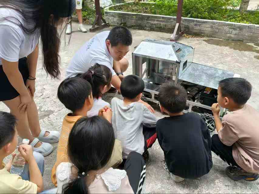 心肺復蘇教學結束后,實踐團成員搬出了由學生自主設計制作的智能機器模型,瞬間吸引了所有小朋友的目光。實踐團成員將其比作“變形金剛”,用生動的語言講解其中的齒輪傳動、連桿結構等機械原理,以及簡單的編程邏輯如何控制機器的運動。一位實踐團成員邊演示邊講解,小朋友們不時舉手提問,現場互動頻繁。