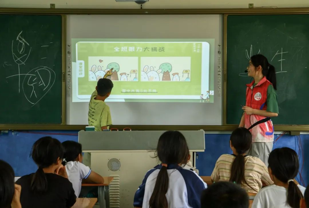 護眼課堂則掀起一場“眼球保衛戰”。志愿者用“相機比喻”生動解析眼睛構造與成像原理,當屏幕上展示近視導致的眼球變形圖時,孩子們瞬間屏息凝神,真切感受到近視的威脅。