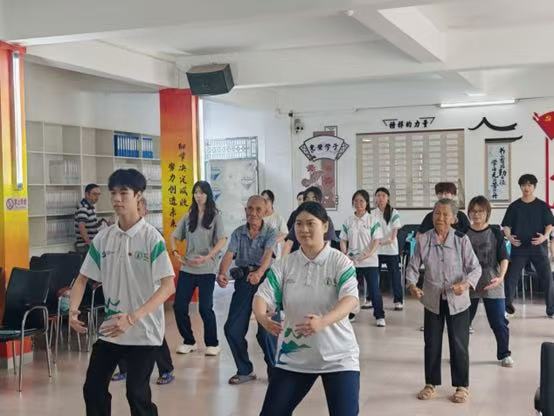 在活動現場,“醫旅助青藤”突擊隊深入當地,為老年村民現場教授八段錦。作為一項源遠流長的中國傳統養生功法,八段錦以其舒展優美的動作、錦緞般的流暢韻律著稱,兼具強身健體、調和身心等多重保健功效。教學過程中,隊員們細致拆解每一式動作要領,確保老人們準確掌握。現場預留充足練習時間,隊員們全程陪伴,及時進行個性化指導和動作糾正。通過這種理論與實踐相結合的方式,幫助老人們快速入門,將八段錦融入日常,實現養生保健,提升晚年生活品質。