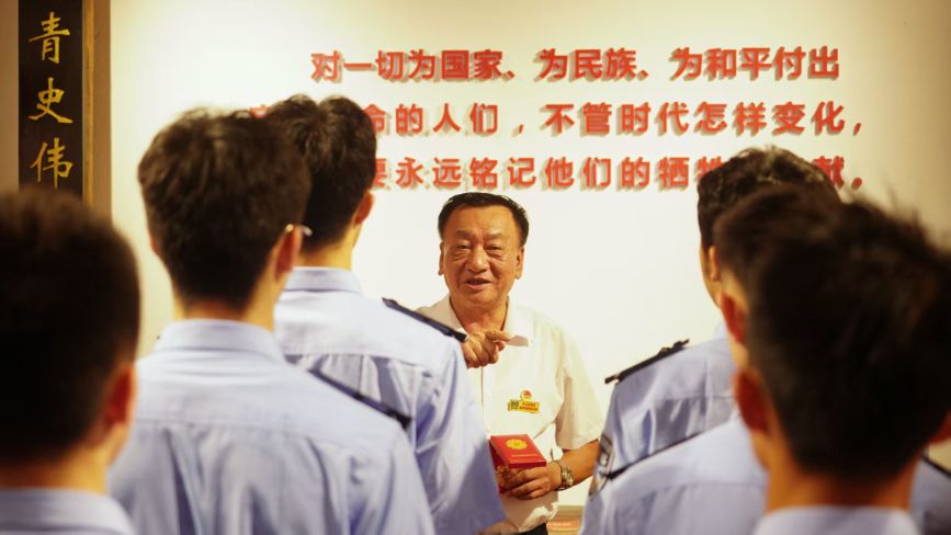 圖為黨支部書記蔡志輝為實踐隊員講解紅色故事。圖為中央司法警官學院 馬致遠攝