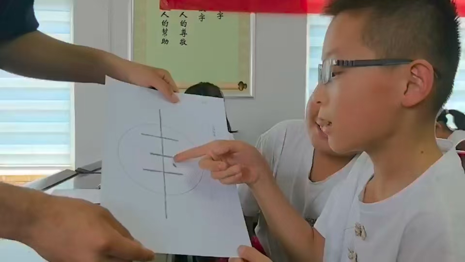 小男孩舉著作品講解:原本的圓與線條,去掉一橫一點,變身“中”字 ;去掉中間豎線,成了“國”字 ;去掉圓圈,又變成“豐”字 !一筆一劃的增減,讓簡單圖形在漢字世界里穿梭,把“中、國、豐”巧妙串聯,藏著對祖國的美好祝福以及強烈的愛國之情。