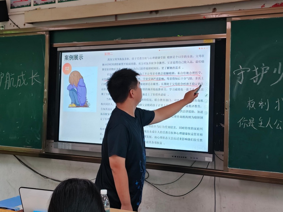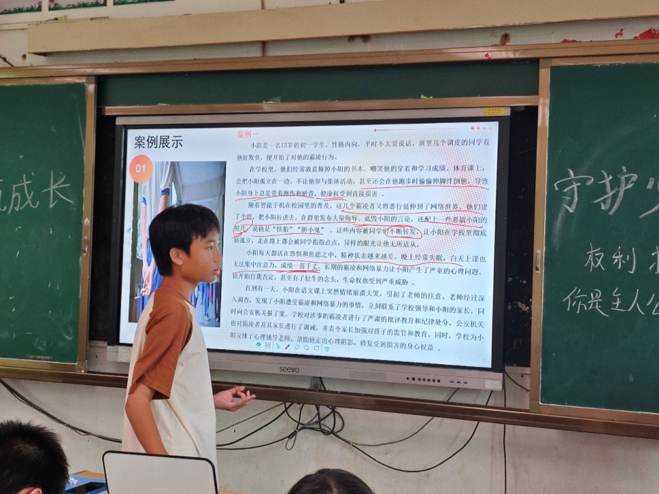貼近生活的案例進行剖析。面對“校園霸凌”、“家庭矛盾傷害”等情境,強烈的代入感讓同學們化身討論主角,踴躍上臺指出案例中的錯誤做法,有的共情無助,有的探尋《未成年人保護法》的維權路徑。