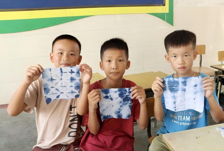 圖為實踐團成員與學生在扎染課后合影。劉欣雨攝 活動伊始,實踐團為學生們帶來扎染課程。志愿者們系統介紹了扎染這項非物質文化遺產的歷史、地域特色及文化價值,并現場示范了折布、捆扎、染色等核心步驟,詳細講解不同捆扎技法形成的紋樣效果與染料調配要點。在志愿者指導下,學生們動手實踐,自主設計布料折疊樣式、選擇染色方案,親手制作出兼具個性與傳統韻味的扎染作品,切身感受傳統技藝的魅力。