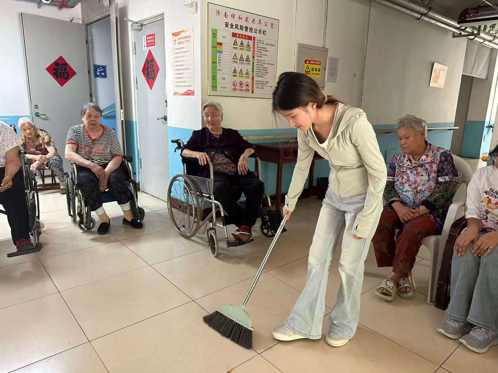 圖為實(shí)踐團(tuán)成員王金鳳打掃養(yǎng)老院大廳