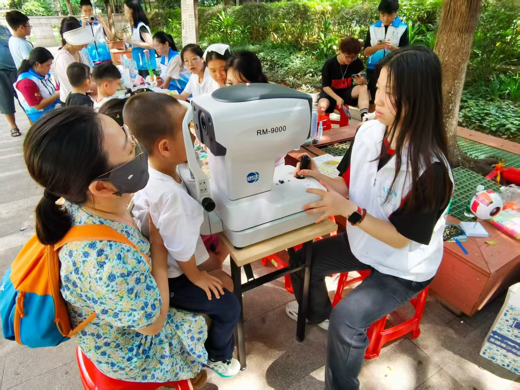 活動現場,“星瞳”宣講團通過海報、手冊講解近視成因與預防要點,耐心解答家長們“孩子揉眼睛是否近視”“網課如何護眼”等疑問,并示范眼保健操正確手法。將宣傳和呼吁落實到每一件小事,每一個疑問上。同時志愿者還攜帶設備為居民免費驗光,幫助大家發現易忽略的健康問題,并針對不同年齡段給出建議,如提醒視力下降的孩子及時檢查。