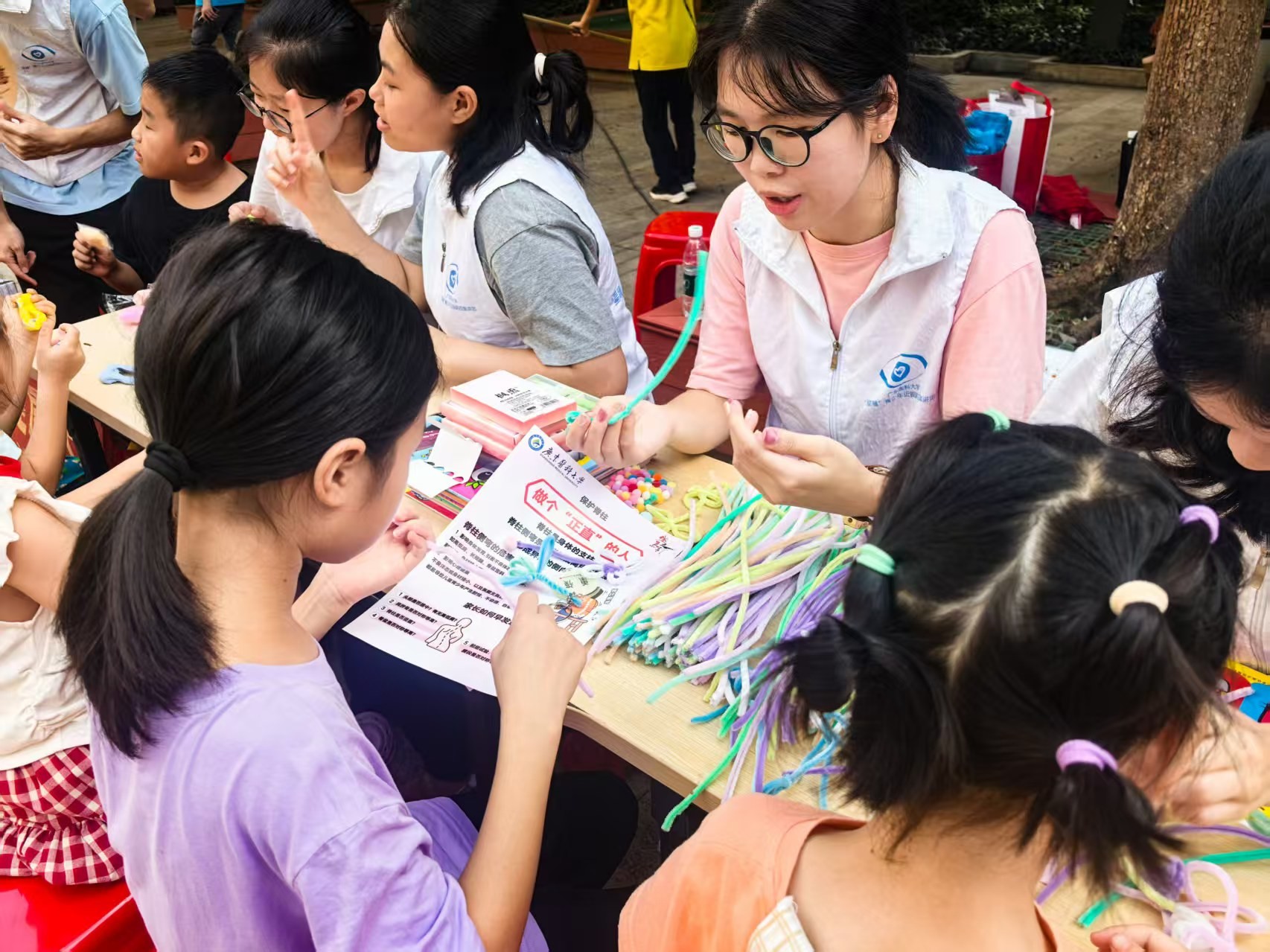 此外,扭扭棒制作、黏土塑形和畫圖創作等互動環節,讓孩子們在動手樂趣中學習護眼知識——拼“明亮的眼睛”、捏“護眼小衛士”時,聽志愿者講“少看屏幕、多遠眺”的要點。這一活動吸引了不少孩子參加,有效提高了科普效果。絢爛陽光下,歡聲笑語中,這樣輕松有趣的氛圍里,護眼的重要性在孩子的心里埋下種子。