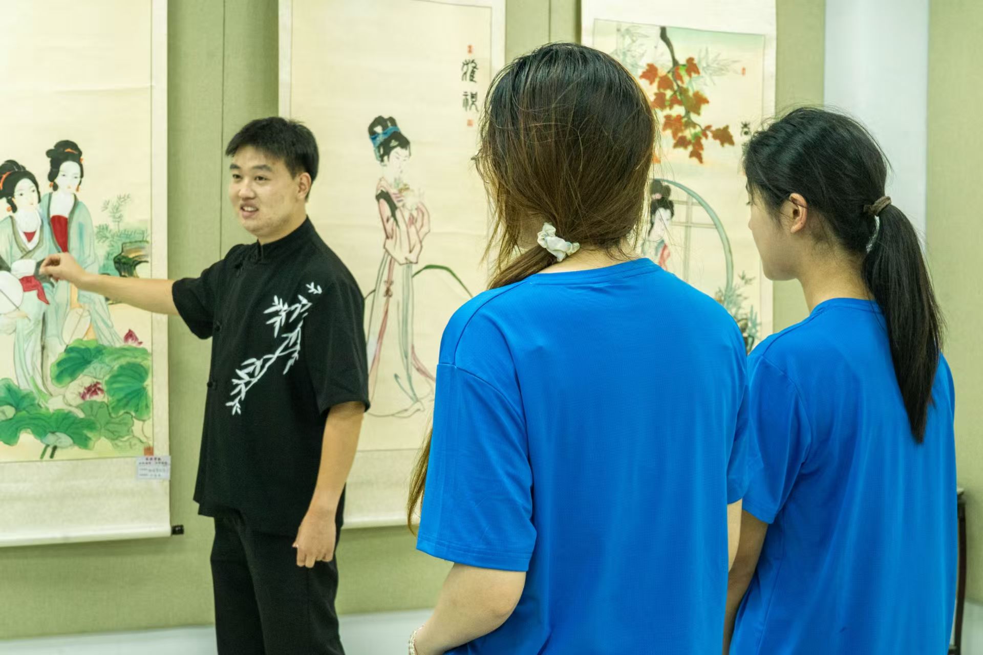 次日,實踐團來到了安徽省界首市文化館,開啟了一場沉浸式的非遺文化學習之旅。館內的陳設古樸雅致,每一件藝術品背后都有一段故事等待著參觀者發(fā)掘。年畫、刺繡、彩陶…… 傳承人將想象力與創(chuàng)造力投射于現實中,也將非遺文化的深厚底蘊展現給參觀者。館內的非遺剪紙傳承人劉廣軍老師作為講解員,為實踐團成員介紹這一件件寄托著創(chuàng)作者的想象力的藝術品。劉老師對每樣展品都如數家珍,在他細致的講解中,成員們感受到了他對非遺文化的熱愛,以及培養(yǎng)非遺文化傳承新生力量的重要性。