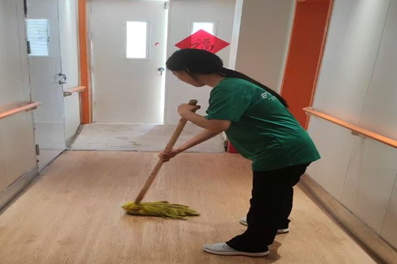 成員們分組對(duì)老人居住的公寓房間、公共走廊、活動(dòng)大廳等區(qū)域進(jìn)行了全面細(xì)致的打掃。從一樓老人們的活動(dòng)娛樂區(qū)域到餐廳的公共區(qū)域再到沉積多日的倉庫,志愿者們認(rèn)真打掃每一處地方,重點(diǎn)擦拭了門窗玻璃,并清潔地面和桌面物品、歸置常用設(shè)施。經(jīng)過小分隊(duì)成員一上午的努力,養(yǎng)老院的環(huán)境煥然一新,老人們紛紛表達(dá)贊許和感謝。