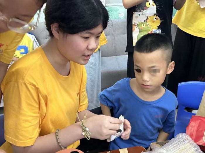 午后的手工室中,艾草、薄荷的清香悠悠散開。這是為水晶寶貝們籌備的香囊制作活動,借由挑選藥材、穿針引線,讓孩子們觸摸草本肌理、感知香氣層次,在傳統技藝體驗里喚醒感官。“星星的孩子”對細微觸感與氣味尤為敏感,于他們而言,志愿者俯身相伴、指尖相觸的溫度,遠比針線技法更珍貴。每一針穿梭、每一味填充,都讓布料與藥香交融成獨特的“成長印記”,把孩子們與世界輕聲交流的瞬間,妥帖收進這方香囊 。