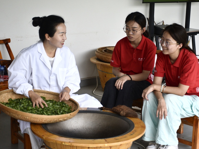 “一芽一葉”的鮮葉采摘標準,并嘗試手工采摘。隨后,胡經理帶領成員們體驗殺青、揉捻、烘干等關鍵工序的具體操作。“殺青主要看茶葉的顏色,揉捻是為了控制形狀和口感,而烘干則是為了控制水分,使茶葉更好地保存,不同品種的茶葉保存時間也不同。”胡經理介紹到,目前茶廠生產基本引用了現代化的生產設備,每一個環節都實現了自動化控制,確保了茶葉的品質和一致性。智能化生產線不僅提高了生產效率,還減少了對人工的依賴,降低了生產成本。這次體驗讓成員們深刻體會到制茶工藝的精細與艱辛,也更加理解了“一片葉子富一方百姓”的內涵。