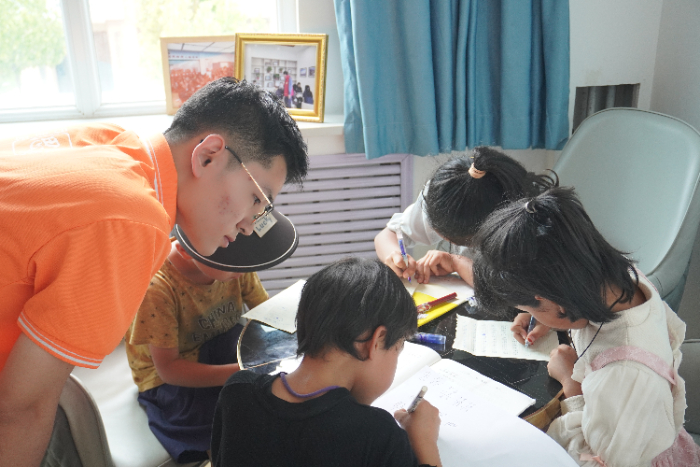 在社區活動室里,30余名孩子整齊有序的坐著,隊員們分散其中,耐心解答孩子們在數學、語文、英語等學科上的疑難問題。來自東鄉族的小女孩馬曉燕拿著數學練習冊向志愿者請教問題,志愿者劉文博俯身拿起草稿紙,一邊畫圖示意,一邊用通俗易懂的語言講解解題思路,直到馬曉燕露出恍然大悟的笑容。作業輔導間隙,實踐隊還組織了豐富多彩的娛樂活動。“我們希望通過這些活動,不僅幫助孩子們解決學習上的難題,更能讓他們感受到來自外界的關愛。”