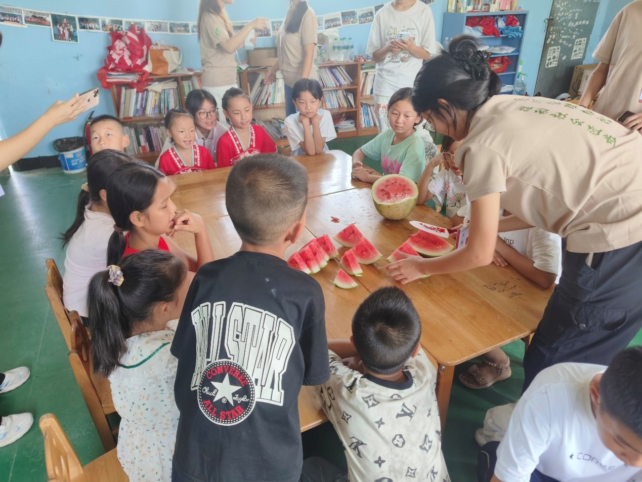 活動中,成員邸夢蕊為孩子們準備了一堂防溺水安全教育課。她耐心教授“防溺水手勢舞”,通過手勢和口訣,幫助大家掌握防溺水知識,課堂氣氛專注而活躍。課程間隙,一位學生家長特意送來清甜的西瓜。這份來自村民的意外心意,不僅為成員們解渴消暑,更讓大家真切感受到當地群眾的淳樸熱情和對支教活動的支持與感謝。