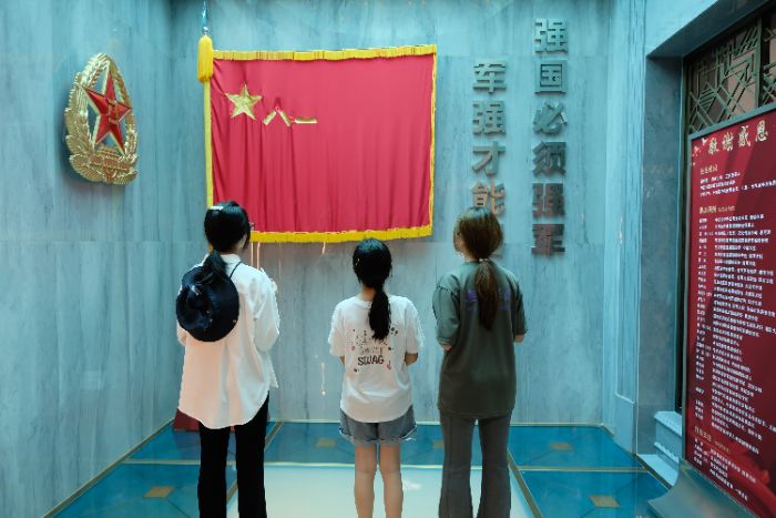 圖為志愿者帶領孩子們參觀八一軍旗。許灝然供圖