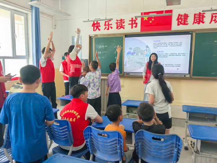 最后,活動到了尾聲。孩子們圍在實踐團成員身邊,“姐姐,你們明天還會來嗎?”“我們還能一起做游戲嗎?”一句句追問,讓實踐團成員眼眶發熱。“我們一定會再來!”實踐團成員楊孝義蹲下身,與孩子們拉鉤約定。此次實踐活動,不僅是一次知識的傳遞,更是一場心靈的對話。正如實踐團指導老師王崢所說:“孩子們眼中的光,是對未來的期待,更是民族團結的種子在發芽。作為新時代的青年,我們要做胡楊精神的傳播者,讓青春在邊疆教育的沃土上綻放。”