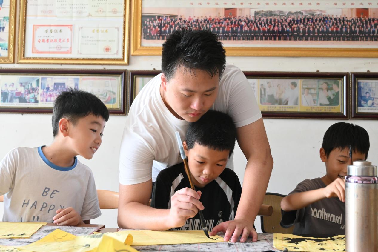 "小朋友們,今天我們一起來學習毛筆字。"徐興遠老師的聲音溫和而有力,嘴角掛著淺淺的微笑。孩子們立刻挺直了腰板,黑亮的眼睛齊刷刷地望向他。老師先示范握筆姿勢,右手拇指和食指輕輕捏住筆桿,中指抵住筆腹,無名指和小指自然彎曲。他邊講解邊做動作,手腕靈活地轉動,筆尖在宣紙上劃出優美的弧線。"看,這樣握筆才穩。"他俯身指導時,指尖輕輕調整孩子的手指,如同春風拂過新芽。教室里只有毛筆摩擦宣紙的沙沙聲,老師額頭上滲出的細密汗珠,映照著他對教學的專注。當看到有一個小男孩寫出漂亮的一筆時,老師眼中閃過驚喜,輕拍學生肩膀,傳遞著無聲的鼓勵。