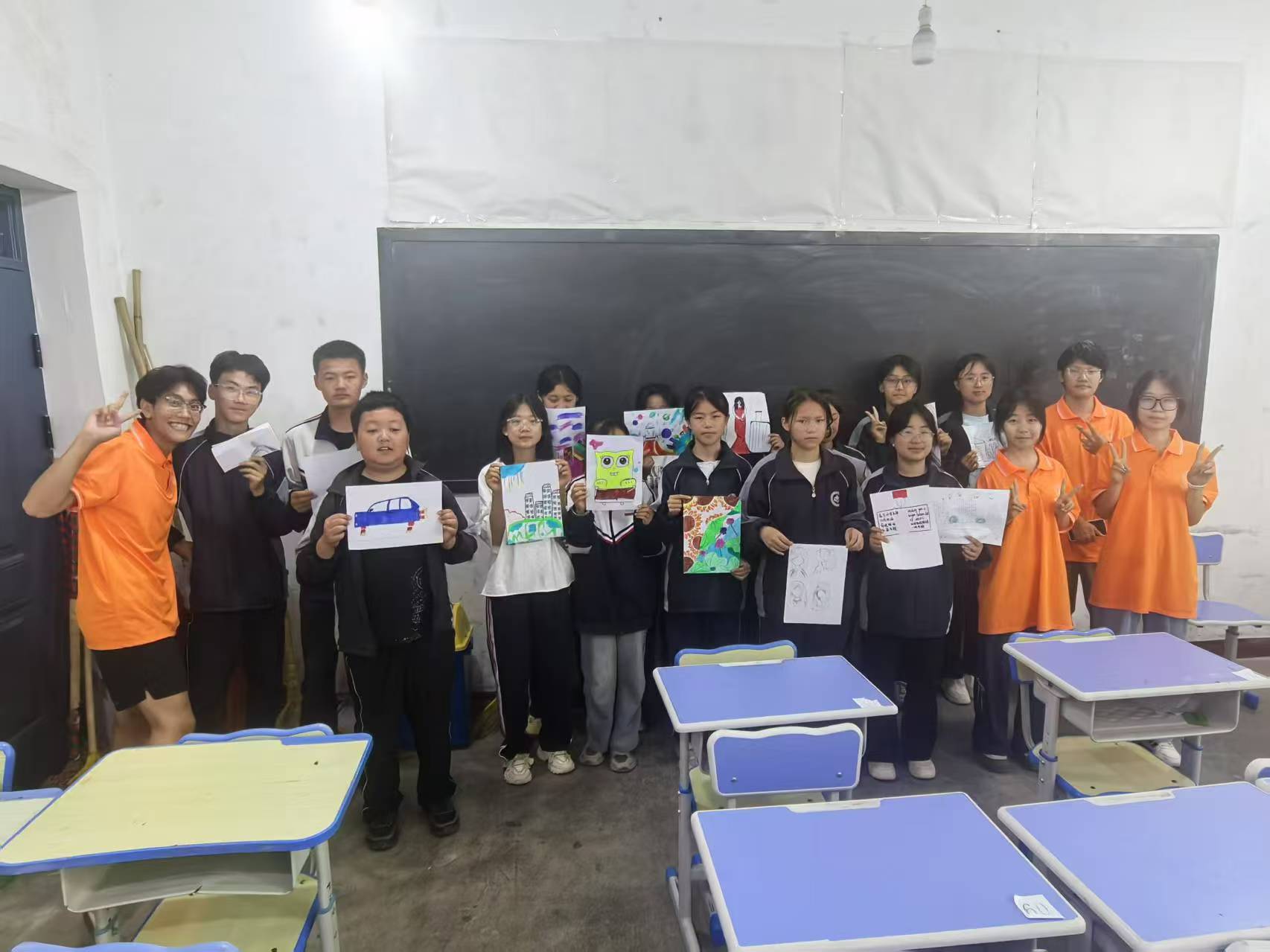 圖為志愿者們與東鄉中學小同學以及他們的作品合影(杜騫 攝)