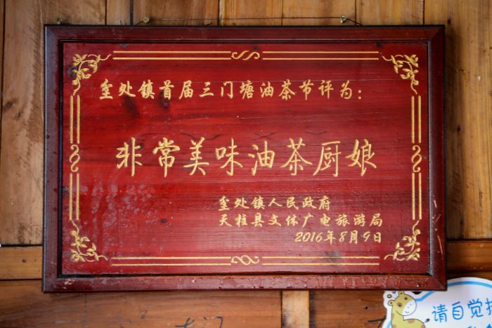 因風味獨特,劉大哥的油茶店在坌處鎮首屆三門塘油茶節被評為:非常美味油茶廚娘。從他的講述中得知,油茶早已融入三門塘人的生活中,每代人都能煮出一鍋地道的油茶。油茶也從來不是普通的飲品,而是延續千年的生活儀式。這碗熱湯里,藏著侗家人對生活的熱愛,成為代代相傳的生活密碼。2023年,侗鄉油茶制作技藝被列入省級非物質文化遺產名錄。各地侗家油茶傳承人通過開設直營店、開發文創產品等方式,讓這門古老手藝在產業化道路上煥發新生。